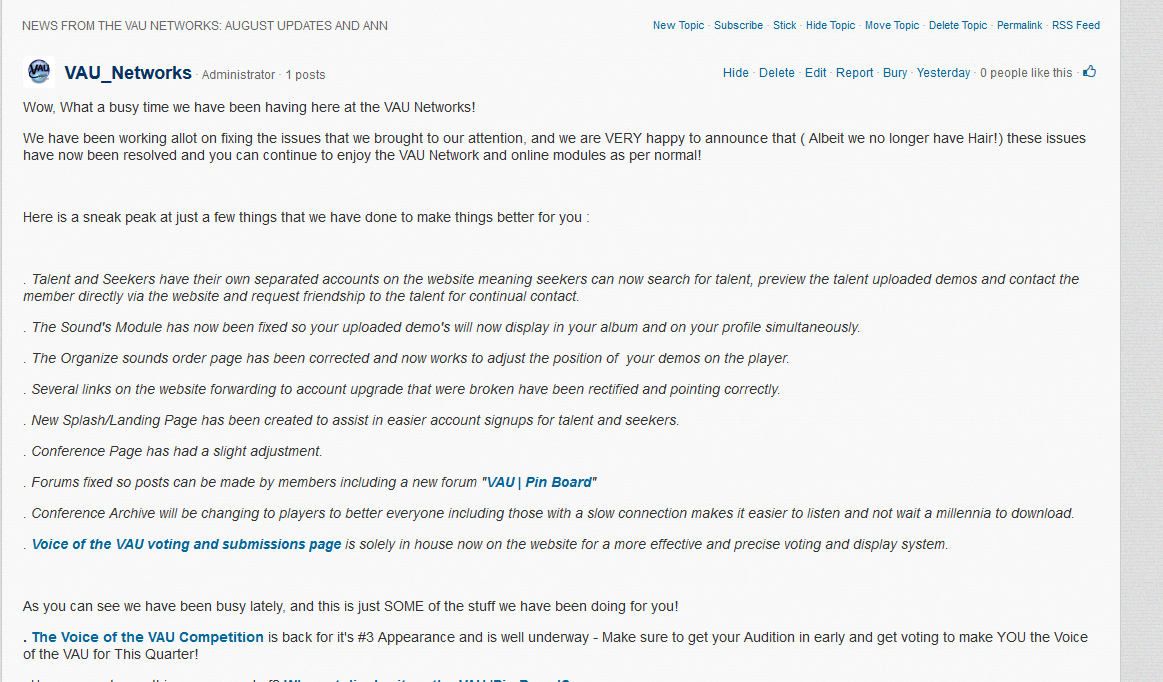 ok using the element inspector, what i see is this: "Wow, What a busy time we have been having here at the VAU Networks! We have been working allot on fixing the issues that we brought to our attention, and we are VERY happy to announce that ( Albeit we no longer have Hair!) these issues have now been resolved and you can continue to enjoy the VAU Network and online modules as per normal!" Is this how your Post starts out?