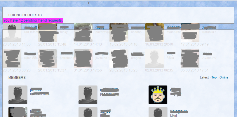 $iProfileID = getID( $_GET['ID'] ); $oDb = new BxDolDb(); $aCount = db_arr("SELECT COUNT(*) FROM `sys_friend_list` WHERE `Profile` = '$iProfileID' AND `Check` = 0 "); if($aCount[0]>0){ $sText = ($aCount[0]>1) ? _t('_pending_frs',$aCount[0]) : _t('_pending_fr',$aCount[0]); $sMsg='<table><tr bgcolor="#FFFF00"><td><a href="' . $site['url'] . '/communicator.php">' . $sText . '</a></td></tr></table>'; echo $sMsg; $query="SELECT *,UNIX_TIMESTAMP( `sys_friend_list`.`When`) AS 'When_UTS' FROM `sys_friend_list` WHERE `Profile` = '$iProfileID' AND `Check` = 0"; $Requests=db_res($query); $sReturn=''; while ($eachrequest = mysql_fetch_array($Requests)) { $sNickName = getNickName($eachrequest['ID']); $sReturn .= '<div class="browse_thumb" style ="float:left;margin:0 0 10px; overflow:hidden; width:122px; position:relative;">'.get_member_thumbnail($eachrequest['ID'], 'left', true ).' '.getLocaleDate($eachrequest['When_UTS'],BX_DOL_LOCALE_DATE).'</div>'; } echo $sReturn; }