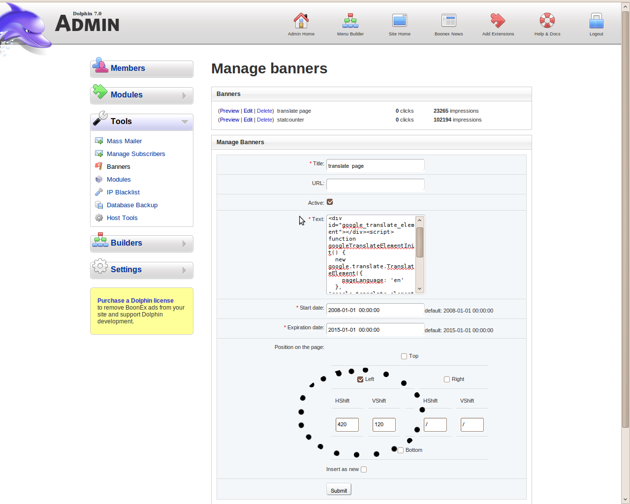 it is done with the banners.. see photo for the coordinates on positioning it -- hope this helps