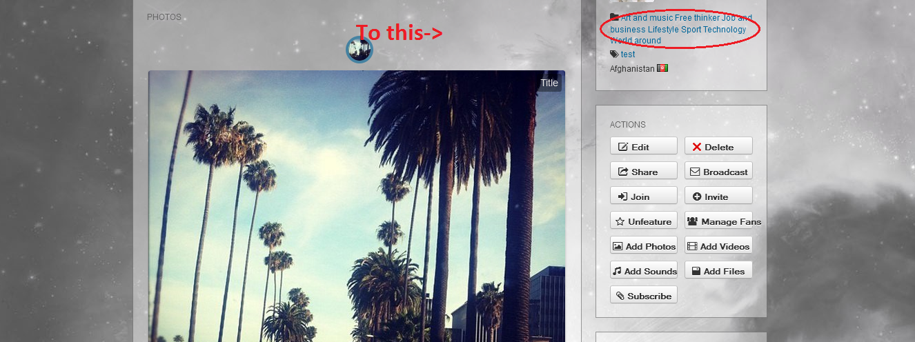In the groups case - your screen.png is the unit.html template, and the tothis.png is the entry_view_block_info.html template. Both found in modules/boonex/groups/templates/base. So, my first thought would be to copy the variable (__cats__) from entry_view_block_info.html to where you want it at on unit.html.
