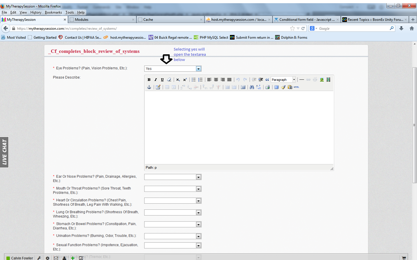In my sample code, the 'EyeProblemD' field is not visible unless the 'EyeProblem' field is 'Yes'. Attached is a screenshot of what the whole form looks like before first selection (before selection.png) and after selection (after selection.png). The no selection.png image is what it looks like if 'No' is selected. Even if selecting 'Yes' first, then selecting 'No' will make the textarea disappear.