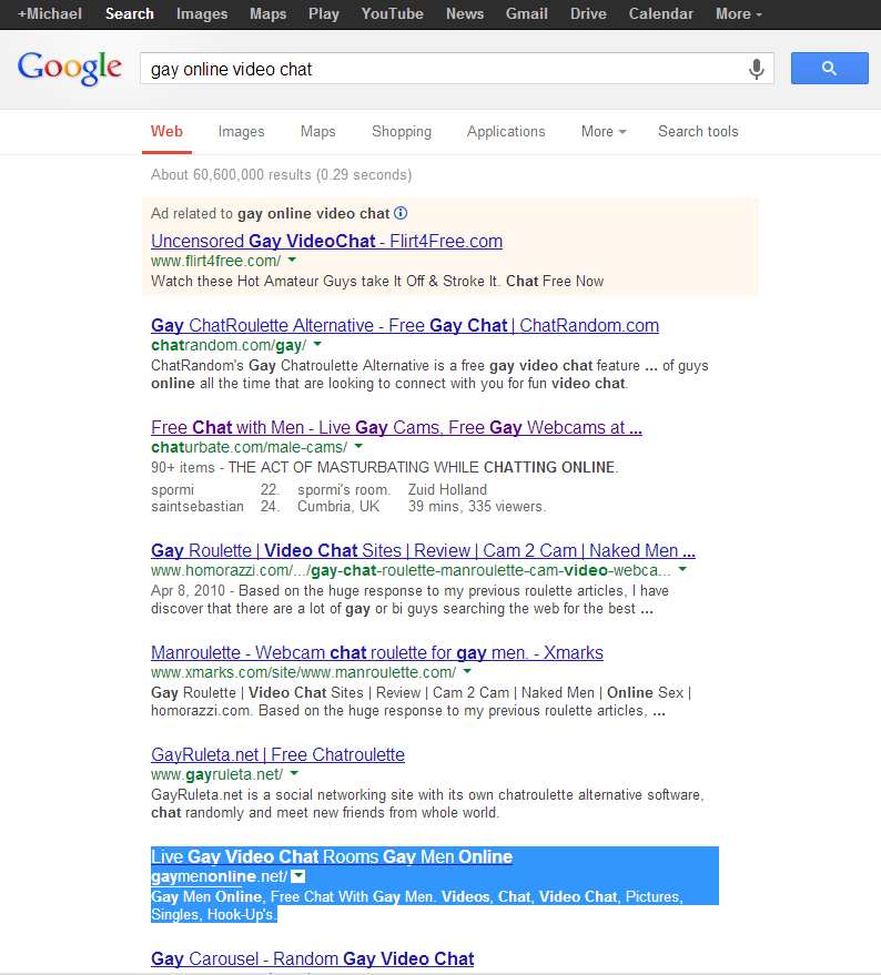e.g. Right now it's "Live Gay Video Chat Rooms," when I start falling in rank I "reword" the title. The next would be like "Gay Men Chat Rooms with Video," I get re indexed and back on the top ten. 80-90% organic searches. Organic is what you want, linking from other sites is a waste of time. IMO ManOfTeal.COM a Proud UNA site, six years running strong! |