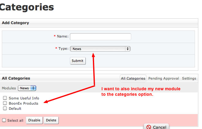 I would also like to know how to include a new module to the site Categories (image attachment included).