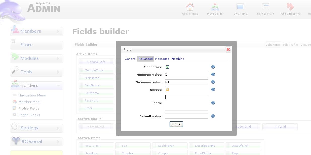What is the expected code I can add to the CHECK field in profile fields?