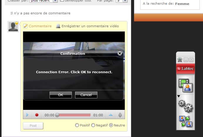 This occur when I click on record. I've anothe problem. When I save the RMS parameters, I get an error message "can't connect to the RMS". Somebody know how to fix this? I ask the hoster and the parameters were good. ths ok this error, does this occur prior to recording or after recording? if prior to recording you have an issue with RMS if after recording, you have an issue with your port not allowing the video to be sent back to the server for processing.