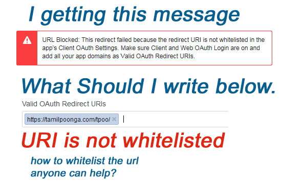 This redirect failed because the redirect URI is not whitelisted in the app’s Client OAuth Settings. Make sure Client and Web OAuth Login are on and add all your app domains as Valid OAuth Redirect URIs.