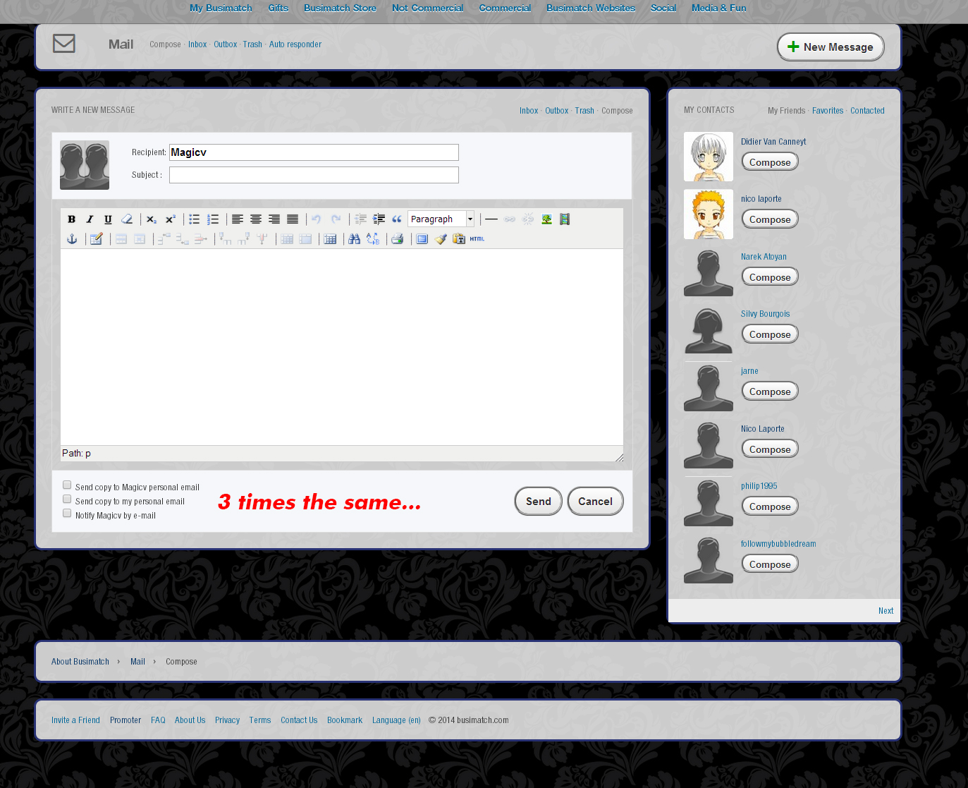 Hello, when i want to send a intern mail, i see 3 times the same. Look at the pic, wwhat i mean. http://www.busimatch.club ( The most exclusive business club) |