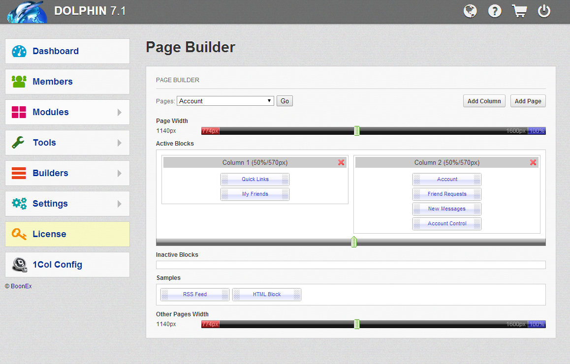 Hi, I am trying to make my account page look like your account page but I am not having any luck. Why does your account page as shown on your site have a lot more options in it than my account page? Under page builder in Dolphin I try to make mine look like yours but there are no options for adding a 'News Feed', Media, Account Edit, or most of the other options your example account page has. What am I doing wrong?