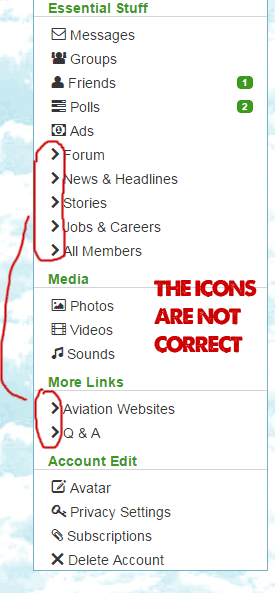 If you want to customize the icons for the custom section (Aviation web site, ecc...) you must search this code part (from the line 211): if($customnamesect1!='0') echo '<div id="rigamenu1"><div class="leftspace"><i alt="" class="sys-icon chevron-right"></i><a href="'.$customnamesect1.'" class="titleitem">'._t('_ibdw_1col_customsect1').'</a></div></div>';