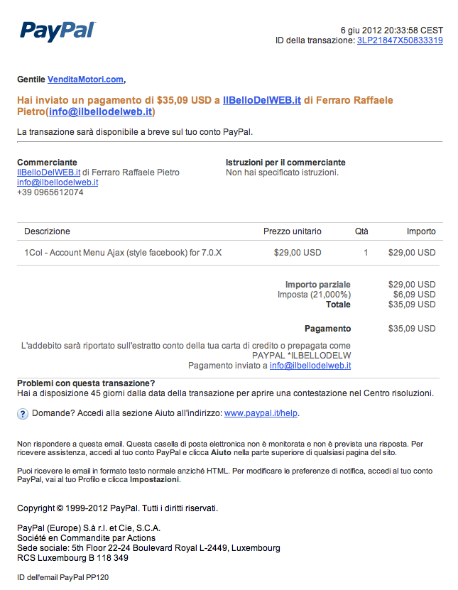 Ti abbiamo già scritto un messaggio in cui ti dicevamo che abbiamo dovuto abilitare il download manualmente perchè il sistema automatico di boonex fallisce quando PayPal applica l'IVA. Puoi quindi procedere con il download.
