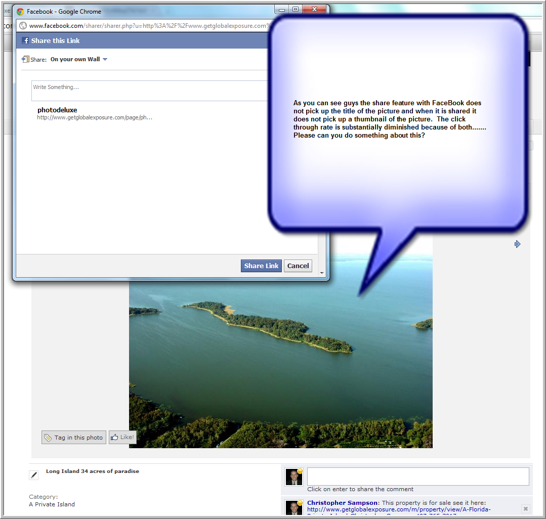 As you can see guys the share feature with FaceBook does not pick up the title of the picture and when it is shared it does not pick up a thumbnail of the picture. The click through rate is substantially diminished because of both....... Please can you do something about this? You are doing an amazing job and I am thrilled with ALL of your mods.............Keep up the amazing work........... Csampson |
