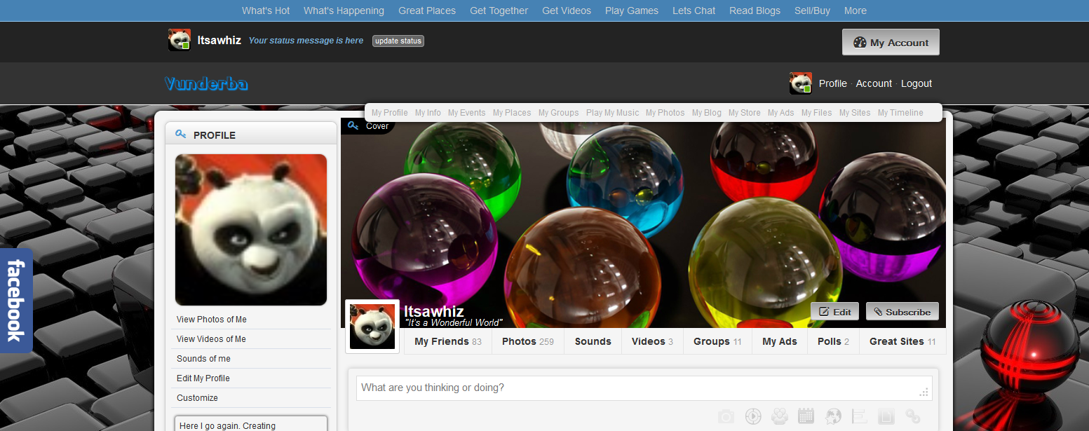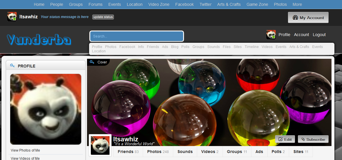 Recommendation that the Profile cover menu should be titled My Friends, My Photos, My Files, My Ads, My Events, My Locations, My Store, Etc. Members are confusing the main menu and the My menu In addition, if you have the profile cover, should be able to eliminate the submenu as a option in the profile page. Having the top menu, the sub menu, and the profile cover menu just confuses the members. That's why it is important to eliminate the sub menu and change the title to the profile menu as stated above. Another improvement would be to add My Timeline to profile cover, because once the header submenu is removed that would no longer available. If this is something that someone else has noticed. Did you find the fix for this to happen. Vunderba..... Challenge Yourself to be the Best...... Hosting from Zarconia.net |