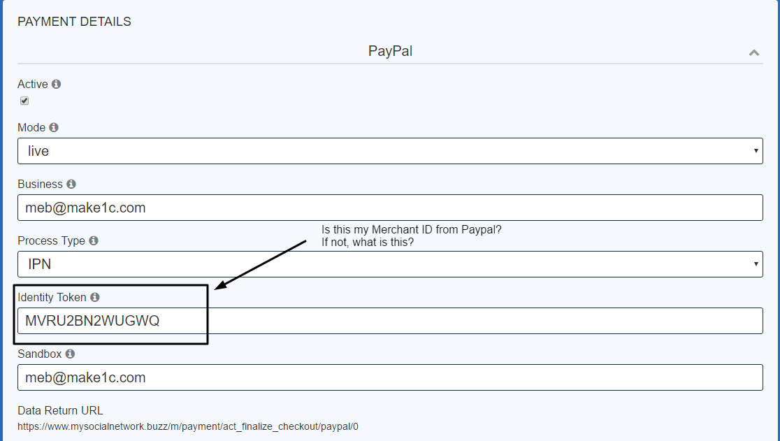 I have gone to Paypal and scoured the profile & settings and cannot find anything like that anywhere. I went to their helps and couldnt find anything on 'identity token' so I have no idea what to put there? Is that the Merchant ID?