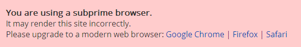"You are using a Subprime browser." "Please upgrade to a modern webbrowser: Chrome, Firefox, Safari"