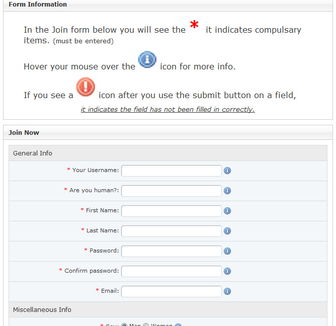 <p style="padding-left: 30px;"><span style="font-size: medium;">In the Join form below you will see the <span style="font-size: medium;"><strong><span style="color: #ff0000; font-size: xx-large;">* </span></strong></span>it indicates compulsary items. <span style="font-size: small;">(must be entered)</span></span></p><p style="padding-left: 30px;"><span style="font-size: medium;">Hover your mouse over the</span> <img title="Information Icon" src="/templates/base/images/icons/info.gif" alt="Information Icon" width="41" height="38" /> <span style="font-size: medium;">icon for more info.</span></p><p style="padding-left: 30px;"><span style="font-size: medium;">If you see a</span> <img title="Error Icon" src="/templates/base/images/icons/exclamation.png" alt="Error Icon" width="42" height="43" /> <span style="font-size: medium;">icon after you use the submit button on a field, </span></p><p style="text-align: center;"><span style="text-decoration: underline;"><span style="font-size: small;"><em>it indicates the field has not been filled in correctly.</em></span></span></p>