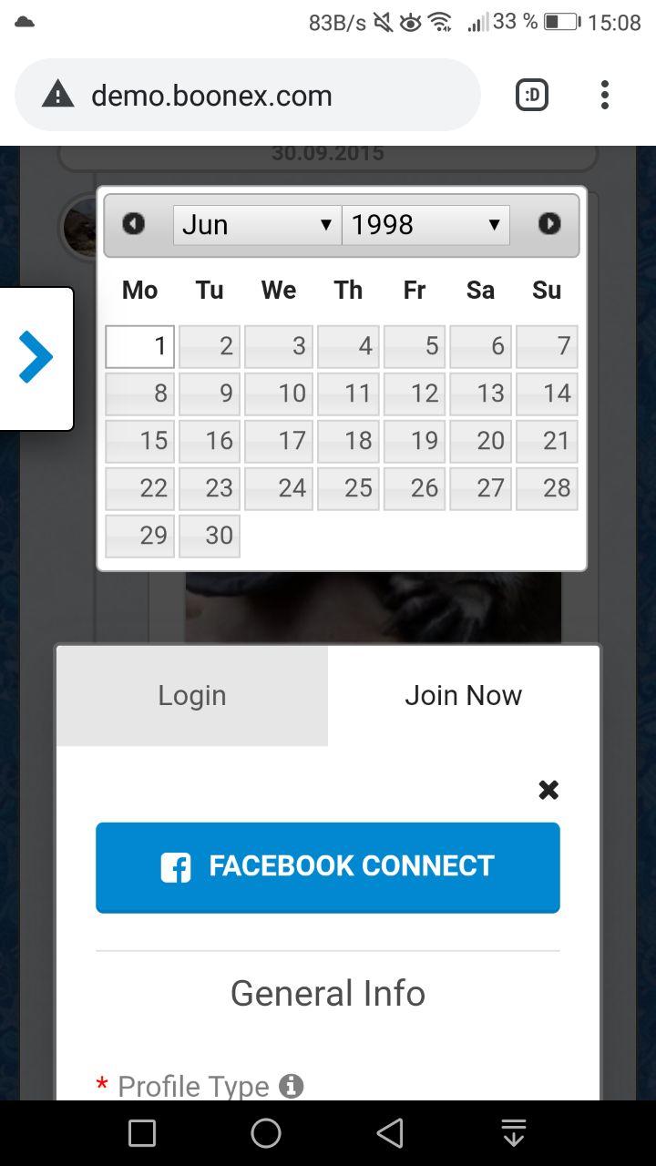 I tested now on 2 different smartphones and with the demo.boonex.com. You have to edit in the admin that birthday is asked in the join process. Because that is left out in the demo by default.
