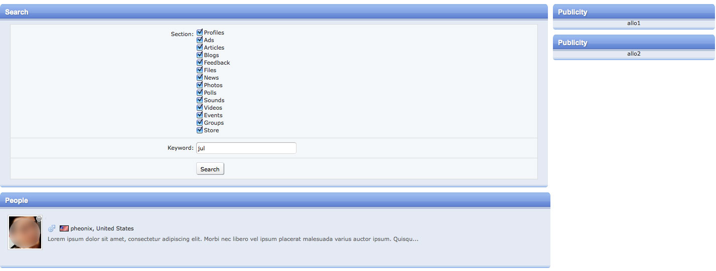 Thanks, it works fine. In SearchKeyword.php To be able to add a column with 2 boxes and keep the search and result in the same column I did this : I replaced the code : $sForm = getSearchForm(); By : $jContent =