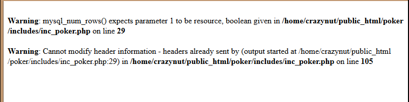 Warning: mysql_num_rows(): supplied argument is not a valid MySQL result resource in /home/vibin/public_html/poker/includes/inc_poker.php on line 29 any idea on how to find this? http://vi-bin.com |