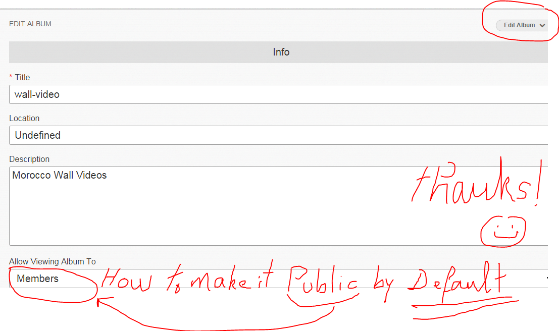Actually this album should be public by default. You can run the following query to set default privacy to public for the albums when they are created: UPDATE `sys_privacy_actions` SET `default_group` = 3 WHERE `module_uri`IN('photos','videos','sounds','files');