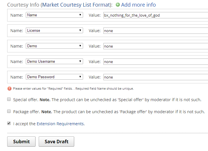 Also demo information and LIC information should not be a required field or Name field for that matter. It's only a service i am offering so why are those fields required. or version number or file upload for that matter. To me the market seems to be turning into an Apple submission and i am not a fan of Apple at all.... https://dolphin-techs.com - Skype: Dolphin Techs |