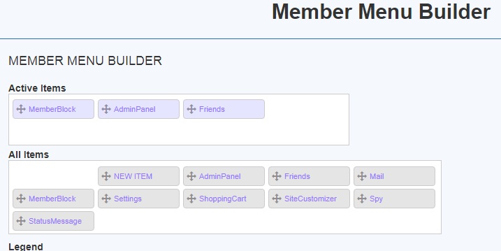 The member menu bar builder is non-functional. You can't drag a new item into place or rearrange any of the items. You can click on an active item and get the properties of that item.