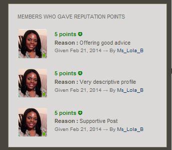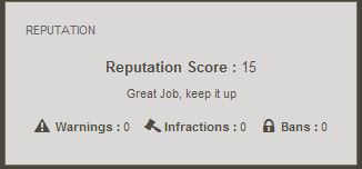 Version 2.0.5 released. (See patches/version_2.0.5 folder in zip file) Added Reason to block showing Reputation Givers. Have recorded the update and now the reputation window is no longer visible. There will only be awarded points which members have displayed. |