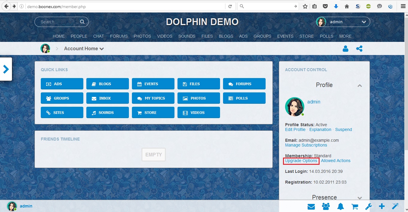 On Boonex Demo, Account page, under Account Control block, Profile section, Membership, there is a link labeled Upgrade Options (see attached image).