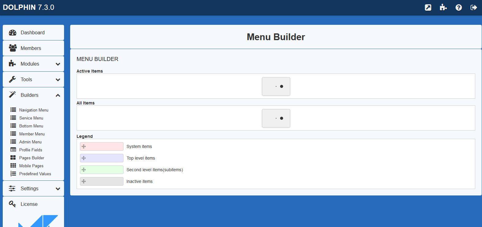 i have fresh installed dolphin 7.3 and in the administration section the menu builders are not loading.