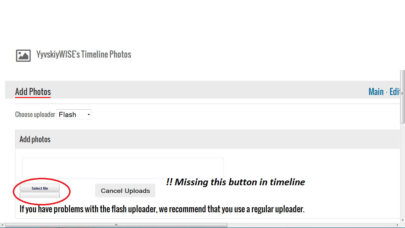 I have circled what I am missing in screenshots. When going to Photos and uploading photos there everything is fine, but not in timeline. I have also tried to change 'singe' upload mode to 'flash' in ..WallModule.php, but as you can see in "PhotosFlash" screen, I have the same problem.