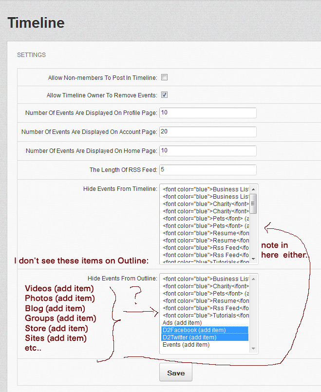 For some reason, when I checked the items in Timeline setting in Admin, I don't see some items such as Videos (add item), Photos (add item), Blog (add item), Groups (add item) etc.. please see attached screenshot. For this reason, my OUTLINE on the front page is not displaying anything. I was wondering if there is a way I can add/update these items in the Timeline setting..