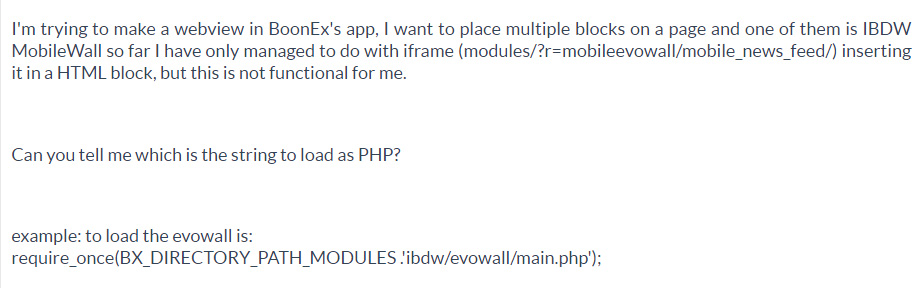 Hello Ilbellodelweb, I'm trying to make a webview in BoonEx's app, I want to place multiple blocks on a page and one of them is IBDW MobileWall so far I have only managed to do with iframe inserting it in a HTML block, but this is not functional for me. |