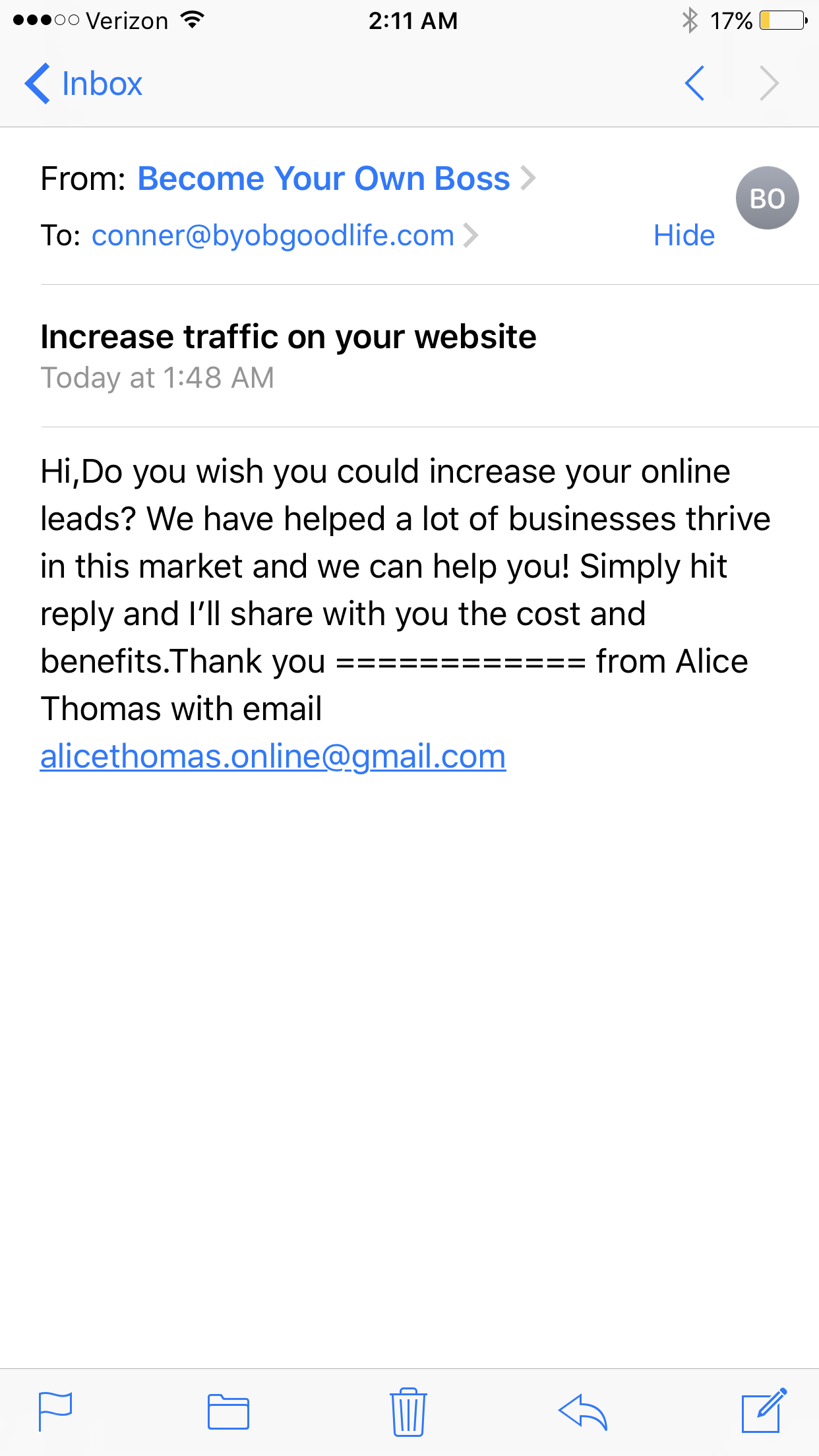 I've been getting text messages and emails all day from people who claim they can gain me leads with my website and help me with SEO. Then about 10 minutes ago, my noreply email emailed my admin email an offer to increase traffic on my website. |