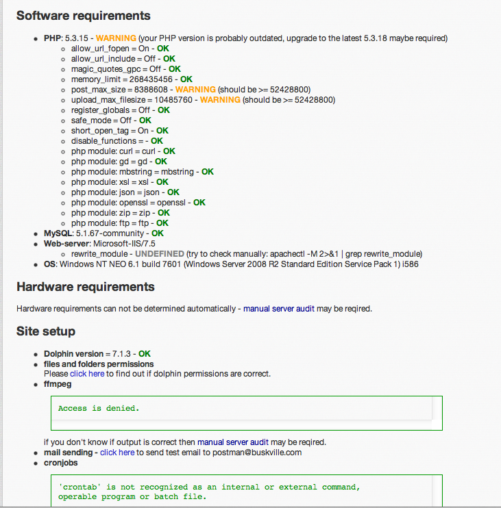 Attached is a screenshot of the host audit. Noticed the memory is off, ffmpeg access is denied and cronjobs is not working.