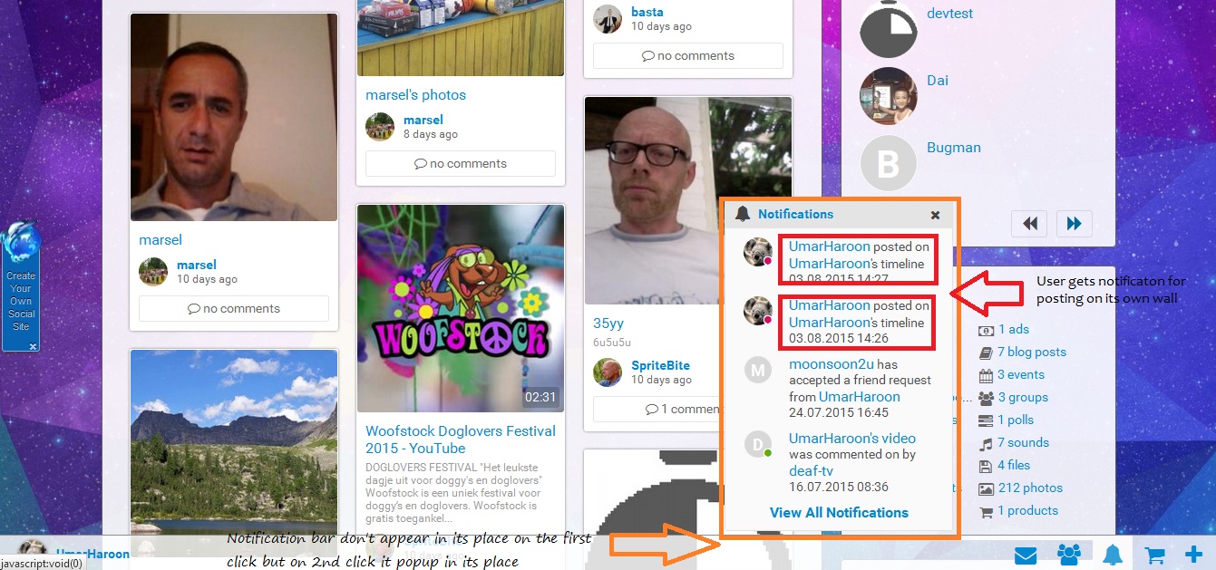 1.First problem is user get notifications for posting on its own wall. 2. On new notification the notification bar don't appear in its place on the first click but on second click it will appear in its place. Umar Haroon |