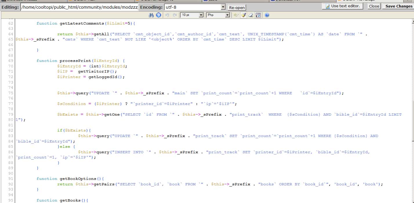 Re-upload : modules\modzzz\bible\classes\BxBibleDb.php Re-uploaded through cPanel as well as FTP client. No change. Downloaded another copy of mod from Unity and re-uploaded that file. No change. Uninstalled mod and re-installed with fresh copy from Unity. Not change. Attached screen shot of latest attempt, cPanel view of page reported giving error (BxBibleDb.php), and copy of the auto emailed report of the database error. The "print verse" button in the actions block is not the one producing the error, it's the "print verse" link in the pop-up window that displays the verse. Not sure if that makes a difference, but thought I should mention it. Thanks for your help. It will be nice to get this resolved. 7.3.5 with responsive UNI |