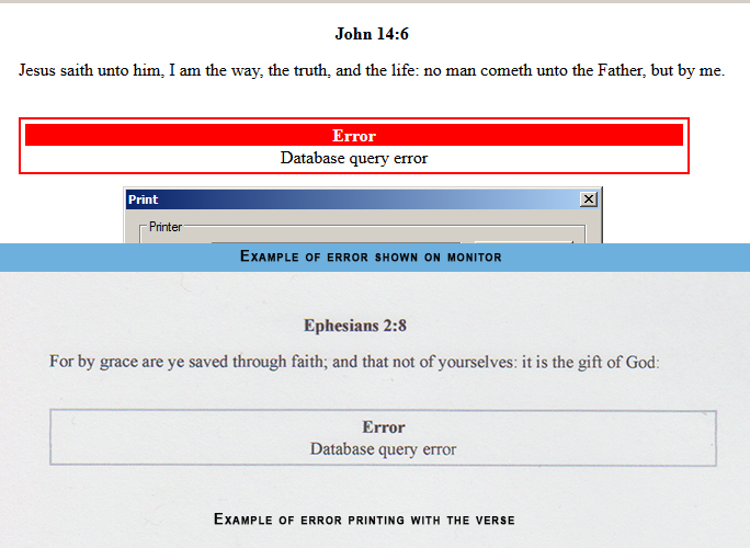 When I print a verse, there is a db error message displayed that is carried over to the actual printing. I've attached screenshot & scan examples of that error warning, as well as the emailed warning sent by the system. Thanks for your help! 7.3.5 with responsive UNI |