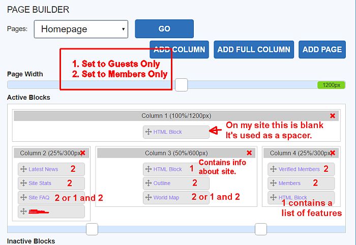 I have a home page which only shows the login, some info about the site and a slideshow which I purchased. When a person logs in, they see none of that on their home page, just the outline and all things a member expects to see. As @truckingspace pointed out, it can be done with Dolphin, or with a third party module which in my opinion isn't really necessary. I did all mine with what Boonex supplies and it works like a charm. It's all done through Page Builder: Admin/Builders/Page Builder/Home Page As you can see from the attachment, setting any of the available blocks allows you to control what guests and members see. Just click on each of the blocks and choose Guest, Member or both. Experiment! Creating your own fancy HTML blocks can make your splash page look really interesting. |