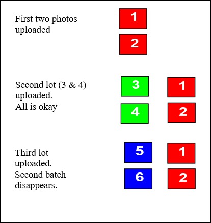 Please see attached schematic. Uploaded photos are displayed in the Timeline and Outline okay. When a member posts additional photos after a break of an hour, they also appear okay.