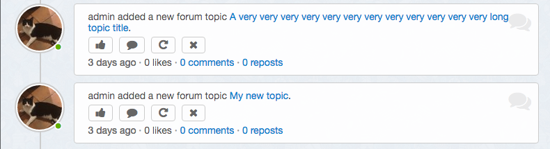 After updating to v7.3, I have formatting & link problems for pkforum posts in the Timeline. (image attached). 1. every forum link in the timeline includes a /0//# at the end which takes users to the very bottom of that particular forum page. 2. the formatting of the link title itself is no longer standard like all other links. 3. lengthy forum link titles get hidden behind the like, comment & repost buttons. |
