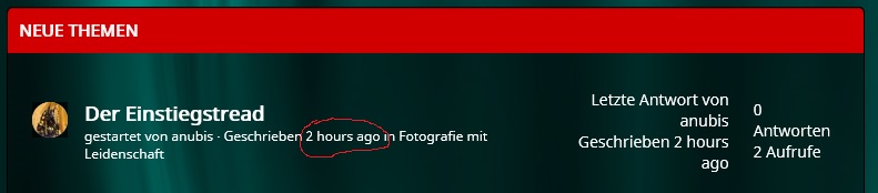 Wo kann ich bei der Themenübersicht den teil " hours ago " ändern. Ist in der Sprachdatei nicht zu finden. Where can I change in the thread view the part "hours ago". Is in the language file can not be found. |