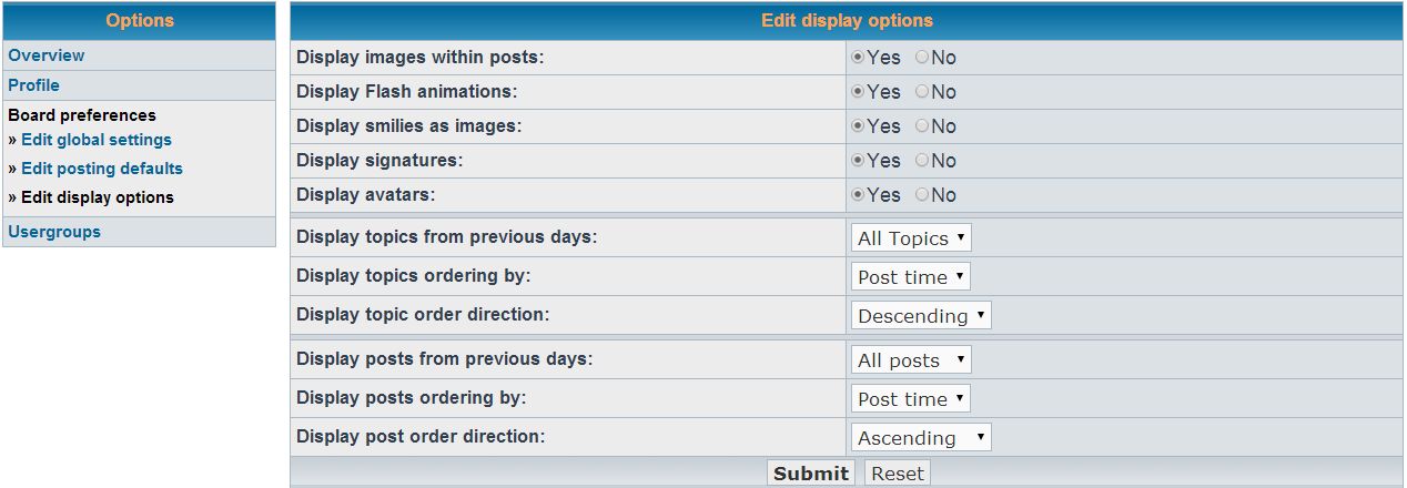 Thanks Paul, then it seems like I need to wait a while. Regarding 3. Sorry, but I don't understand your reasoning with this. You've implemented it at the admin level, for the admin to choose which sequence posts should appear, but don't you see that's a useless option? Who cares what the admin's preference is, when it's the users preference that matters. I am saying that in this case the option has been ill conceived and should be addressed properly, as it is on popular forum software such as phpBB (see attached for phpBB user display preferences). Regarding 4, I guess I'm a little disappointed that this cannot be included with the initial release, as it's just a few lines of code. I have a different mind set here. I see it as a bug not being part of site search, it's that simple. You need to support the existing Dolphin features, and this is the first search that new users to a site will use. Please don't see this as criticism per se, sometimes I'm just a bit blunt when I'm passionate about something. Rod | www.mystampworld.net | hosted with BoonexHosting.com |