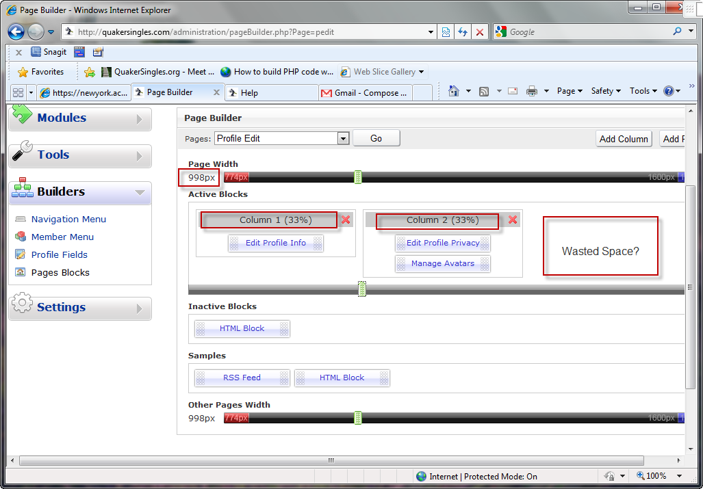 OK- So, I may be close on the problem. I checked. Sure enough the page size is 998. Each of the two columns takes up 33% and one third of the area on the right, remains blank. I'm gonna fiddle around with this some more, but if anybody has some help. I would like each column to take up 50% if there are only two columns. I attached a screenshot for a better description of what I am dealing with. Thanks! Peer Peer L. Plaut Executive Director, Single Booklovers Connecting Bookworms Since 1970 |