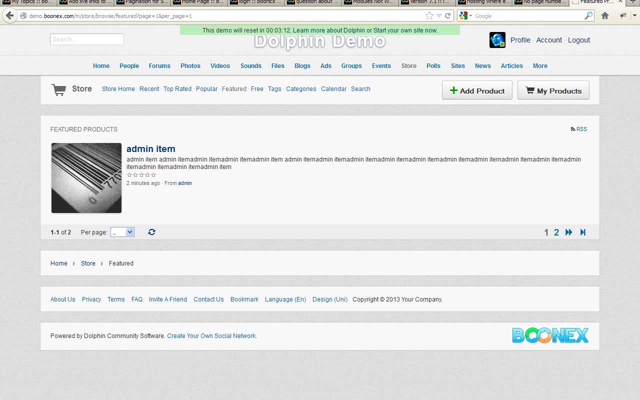 Hello! Demo is reset every 30 minutes and we have there only 1 store item only. So i added one more, but u may didn't see it because it was erased after refresh. But u may see my screenshot - i added 1 again and marked it as featured. See image: So pagination in store works fine from our side. If u have another behaviour in ur Dolphin site then plz provide us URL and 1 test user access to check what can be wrong. |