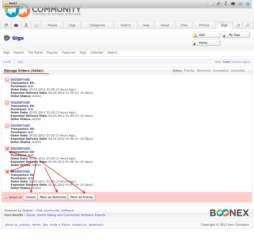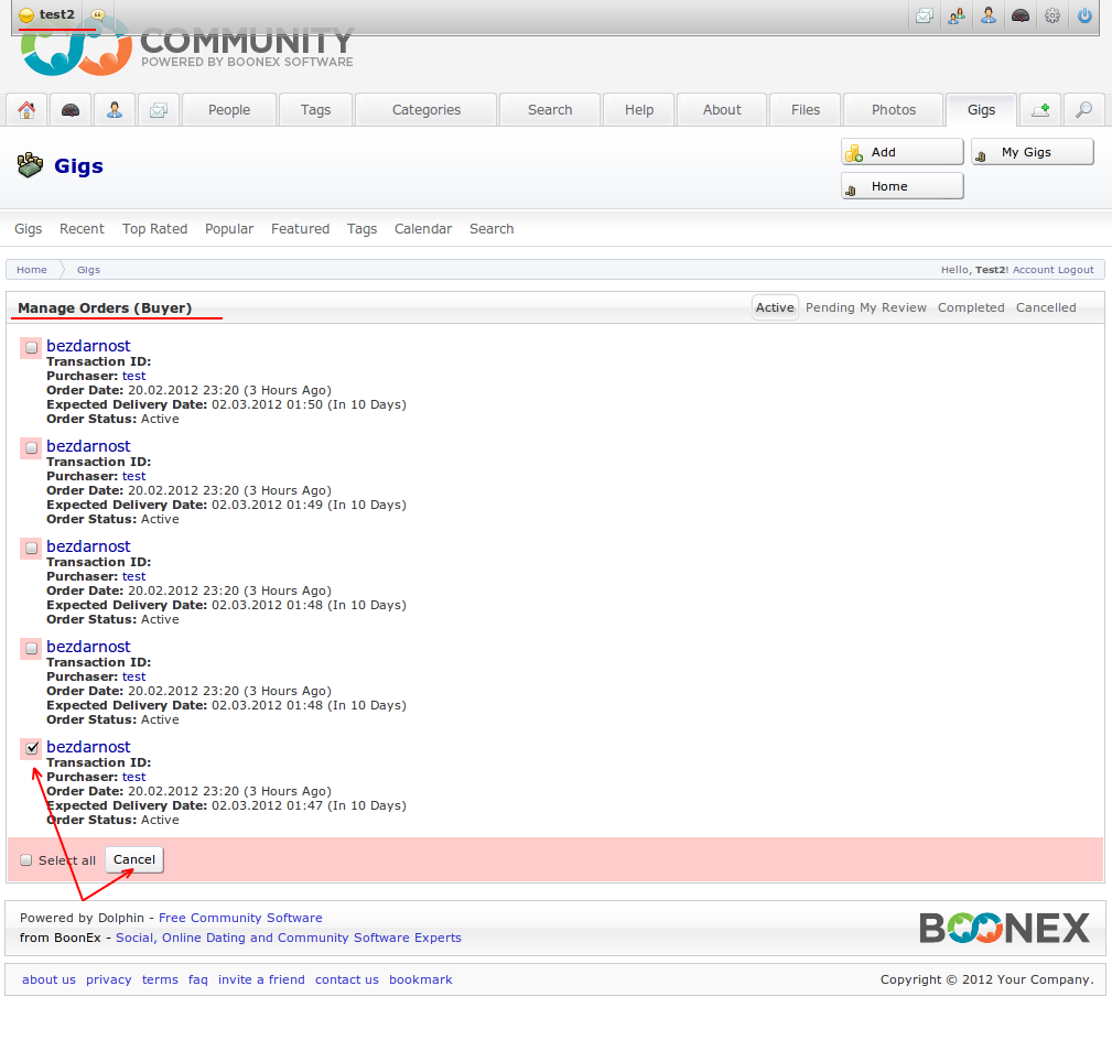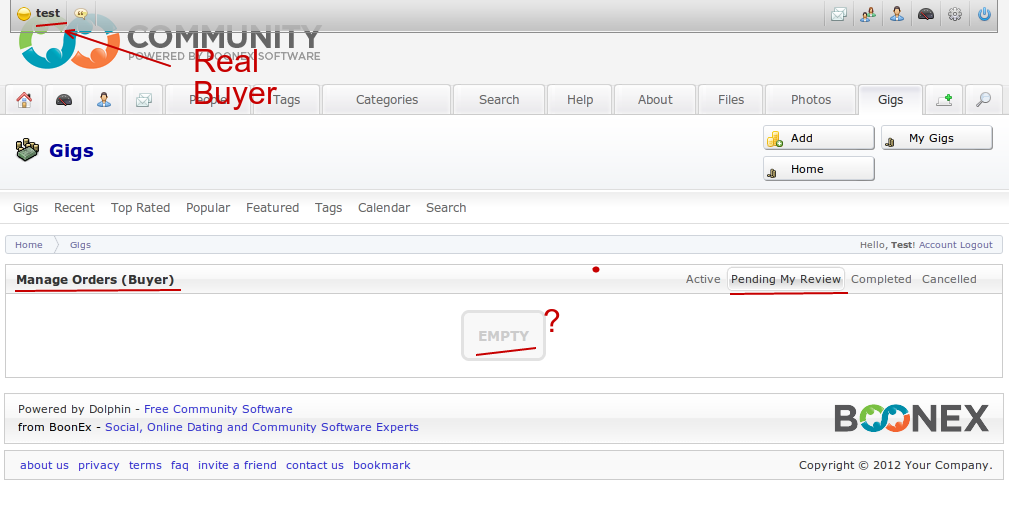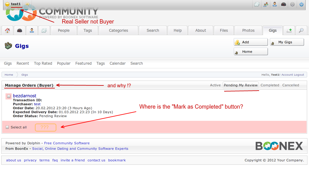 Вот доказательства. 1. самое невинное. нет кнопки Mark as Completed (pic1.png) 2. причина по которой эта кнопка отсутствует. (epicFail.png) 3. продавец test1 (realSeller.png) имеет доступ к явно не предназначенному для его глаз контенту.(pic1.png) 4. покупатель test же, попрощавшись с денежками, вообще ни к чему доступа не имеет.(BuyerKingNo.png) 5. зато любой желающий test2, пройдя по ссылкам Seller Orders и Buyer Orders ( /m/gigs/browse/seller и /m/gigs/browse/buyer ) может может видеть, аннулировать, манипулировать и стирать чужие услуги. (omg.png) и (wtata.png)