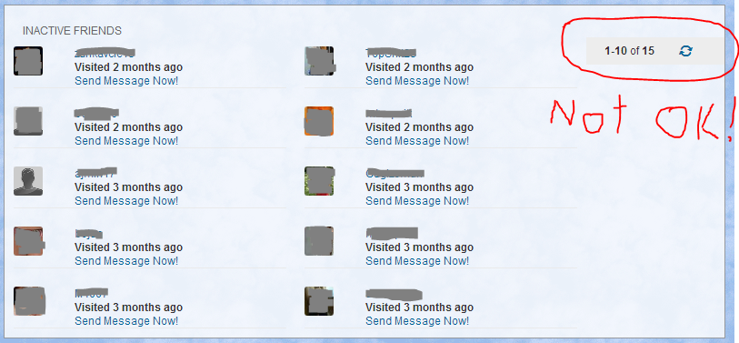 After all the strugle and requests to developer, the module is now finaly compatible and working properly with Dolphin ver.7.1.x. - almost. There is still one problem I've noticed. If module is positioned on the left, narrow part of the Account page the generation of arrows to browse to next page of inactive frends is OK, visible and it works while if positioned on the wider - centered part of the Account page it is not generated at all. It just shows a certain number of those friends but one can not browse for the rest of them since there is no arrows to click on it.... OK: