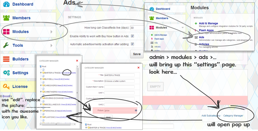 admin > modules > ads > category manager > select category and change "picture" to desired awesome icon name. save. good to have the awesome site open in another tab while doing so.