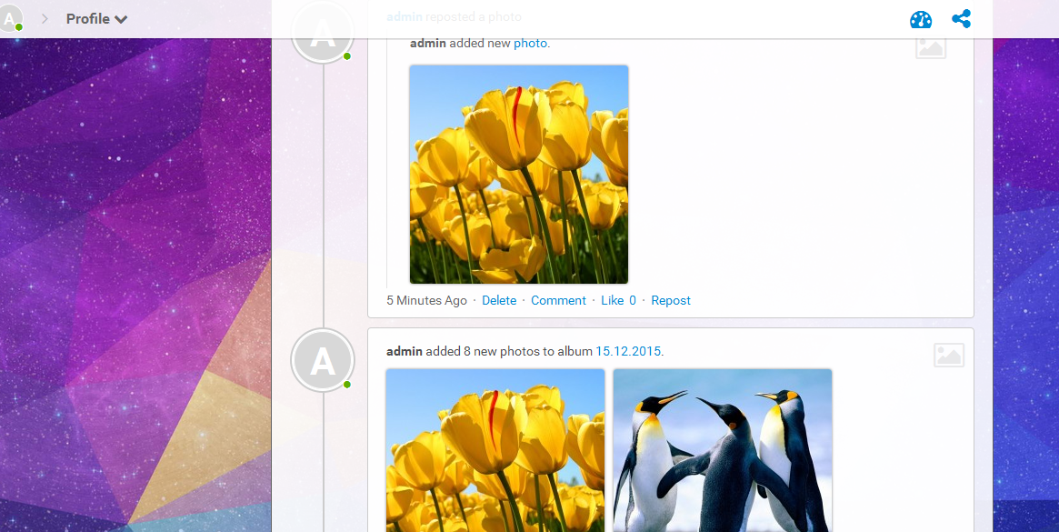 If we Repost a Photo album it only post 1st picture. This way you can't repost 1st picture individually, rest of the pictures can be reposted individually. Also Repost sign should be used in the timeline instead of Repost in writing. And Thumbs up or any other image for Like to save space for the mobile view.