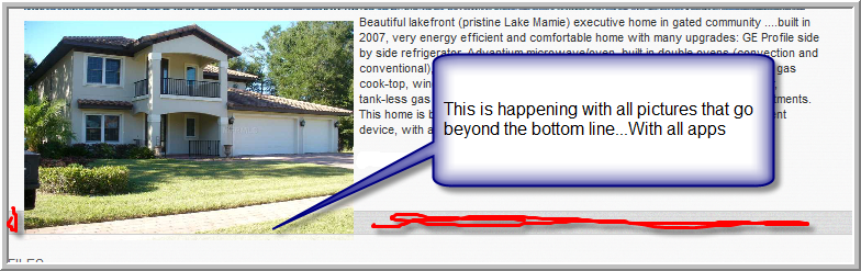 The picture should not go past that line towards the bottom it should stay inside the off white box and not leak below it...We are looking at the description field used in the tinymce but it's happening with all modules... The picture is going outside the appropriate box that should be holding it which causes it to go over the background as well...The red is the background... Csampson |