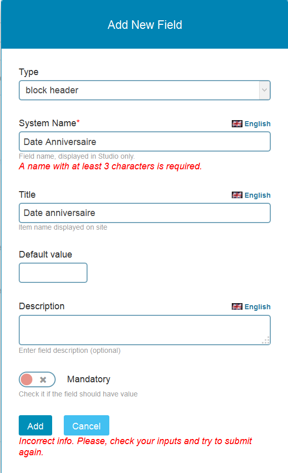 The problem is that you entered name for English language only, you need to enter the name for all languages you have installed. Rules → http://www.boonex.com/terms  |