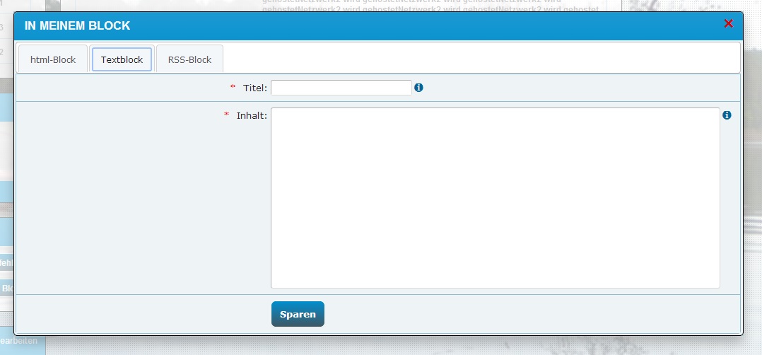 function getTextBlockForm($aBlock){ 3- Change to this: function getTextBlockForm($aBlock){ The changes are in blue....(9 gives you simple TinyMCE) Hopefully this configuration will work for you... Anton of course is the expert here, and he may know some advantages or disadvantages to doing this. Hope this helps :) |